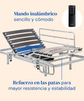 Cama articulada: Somier eléctrico con estructura de acero reforzado y lamas anchas de madera para un apoyo seguro. Se regula fácilmente con mando por cable, permitiendo articular respaldo y piernas con total comodidad. Compatible con accesorios opcionales.