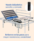 • Cama articulada: Somier eléctrico con estructura de acero reforzado y lamas anchas de madera para un apoyo seguro. Se regula fácilmente con mando por cable, permitiendo articular respaldo y piernas con total comodidad. Compatible con accesorios opcionales.